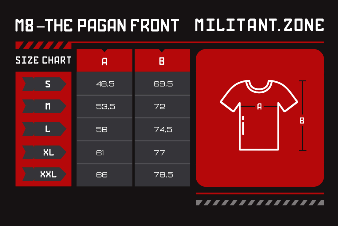 Plain t-shirt with M8L8TH logo – the ultimate simplicity of black metal design! Large print in front, wolf-hooks on the sleeves and the original “The Pagan Front” logo on the back.